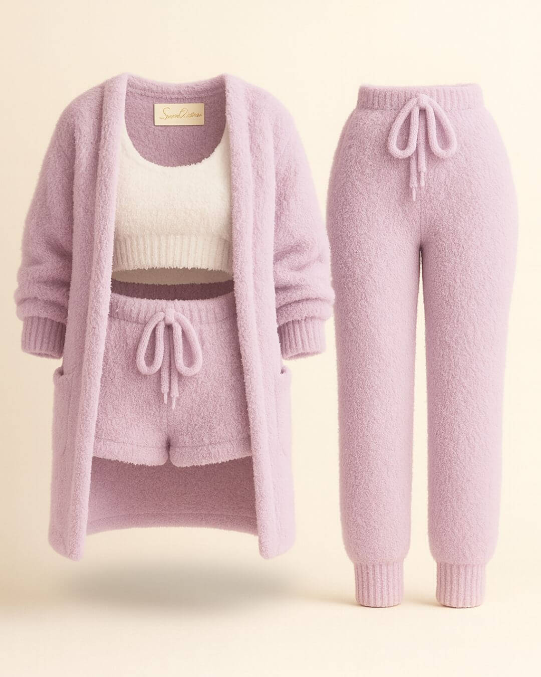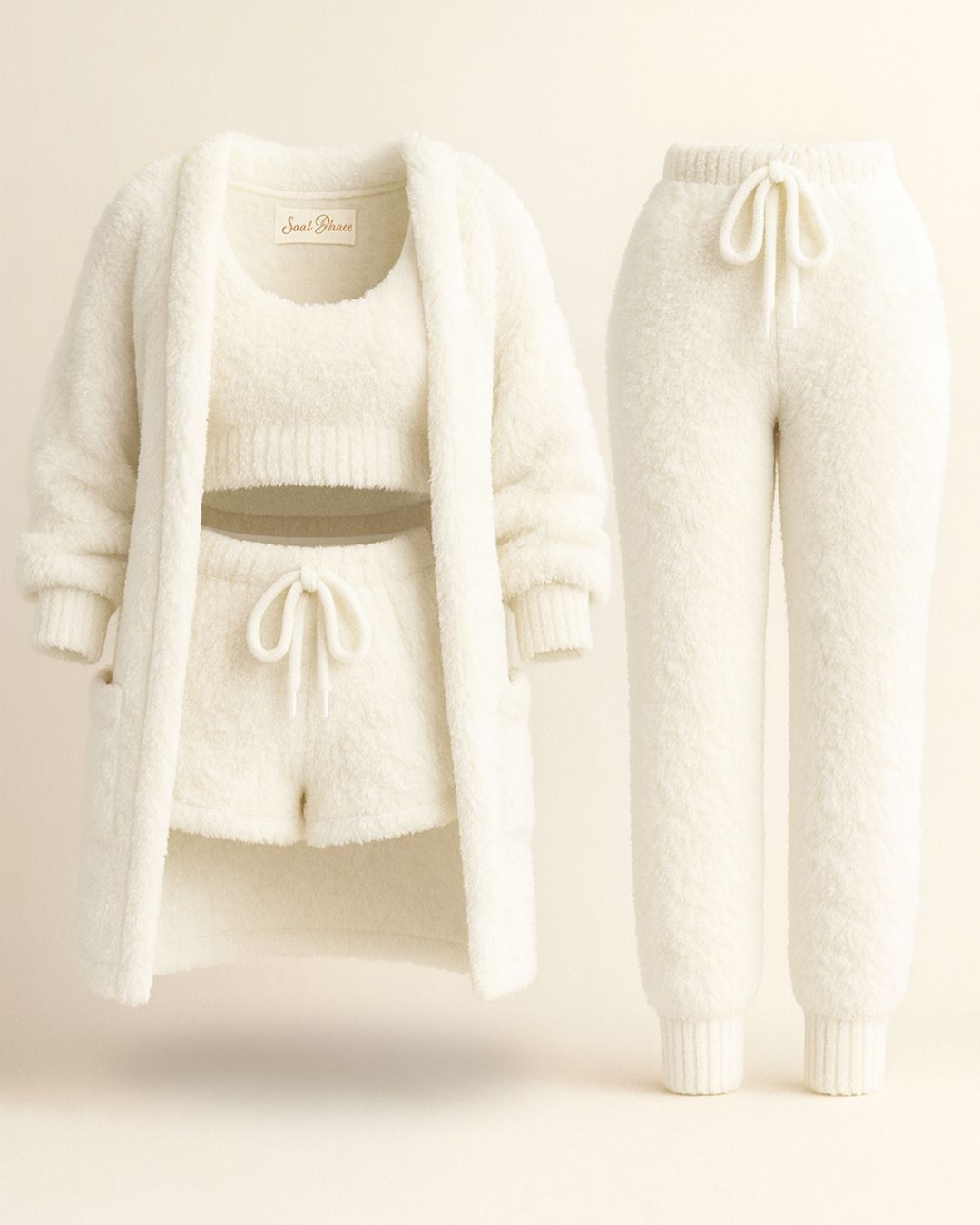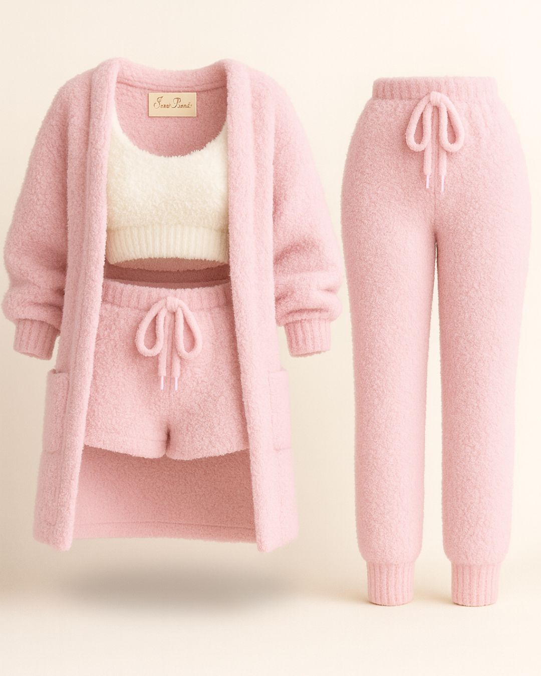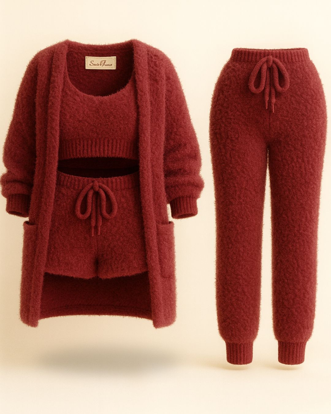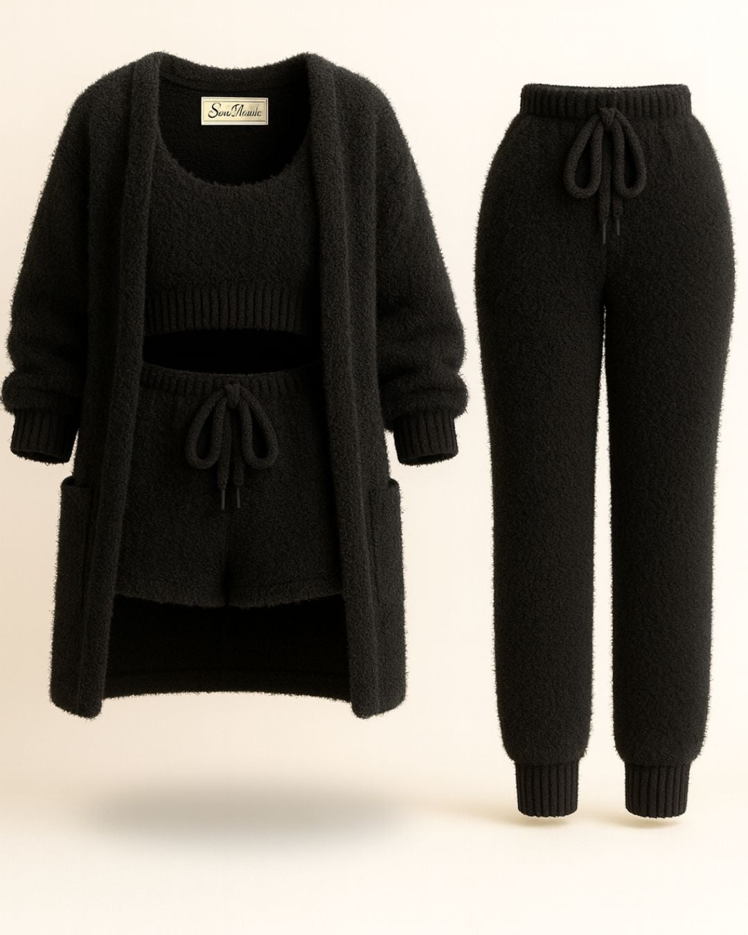 Det ultramyke, løkkestrikkede stoffet i 100 % fleece holder deg varm uten å føles tungt, mens hvert plagg er utformet for å følge dine bevegelser med letthet. Enten du hviler, jobber hjemmefra eller nyter et rolig øyeblikk, gir Saint Prairie-settet deg ultimat velvære — fra morgen til kveld.